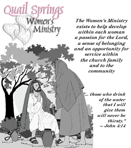 Our goal this year for the women of Quail is, like our Samaritan woman who asked Jesus for spiritual drink that would forever quench her spiritual hunger and thirst, to offer this same �living water� through our ministries in the areas of Spiritual Growth., Encouragement and Missions/Service.